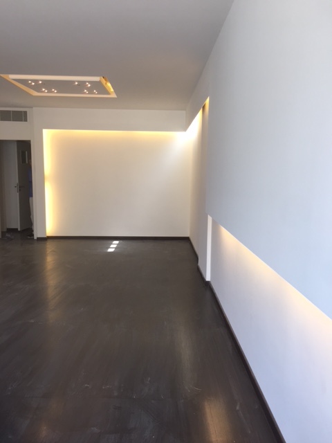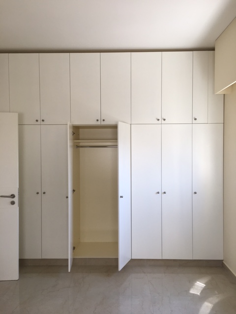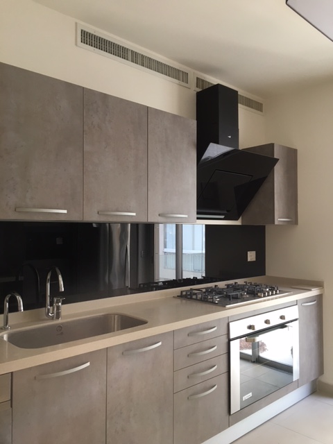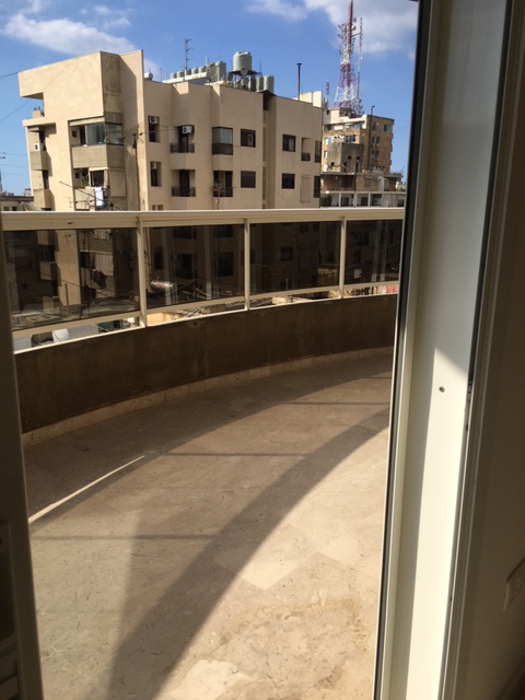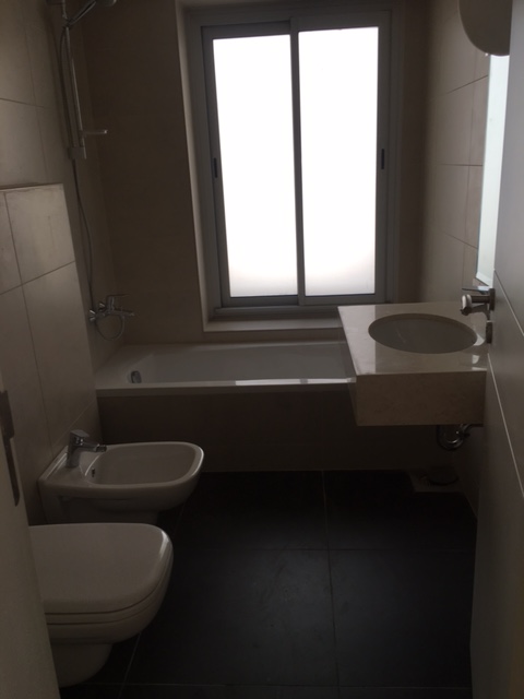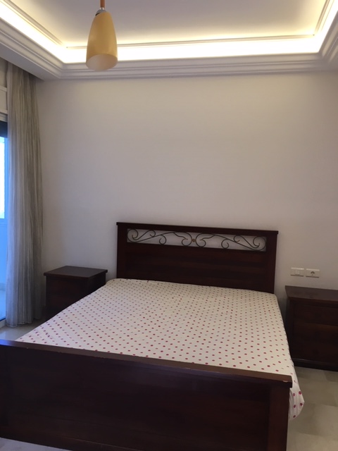 New building, 5th floor,central, 3 bedrooms, nice fully equipped kitchen, 1 living, chauffage, A/C, parking, generator, store room.